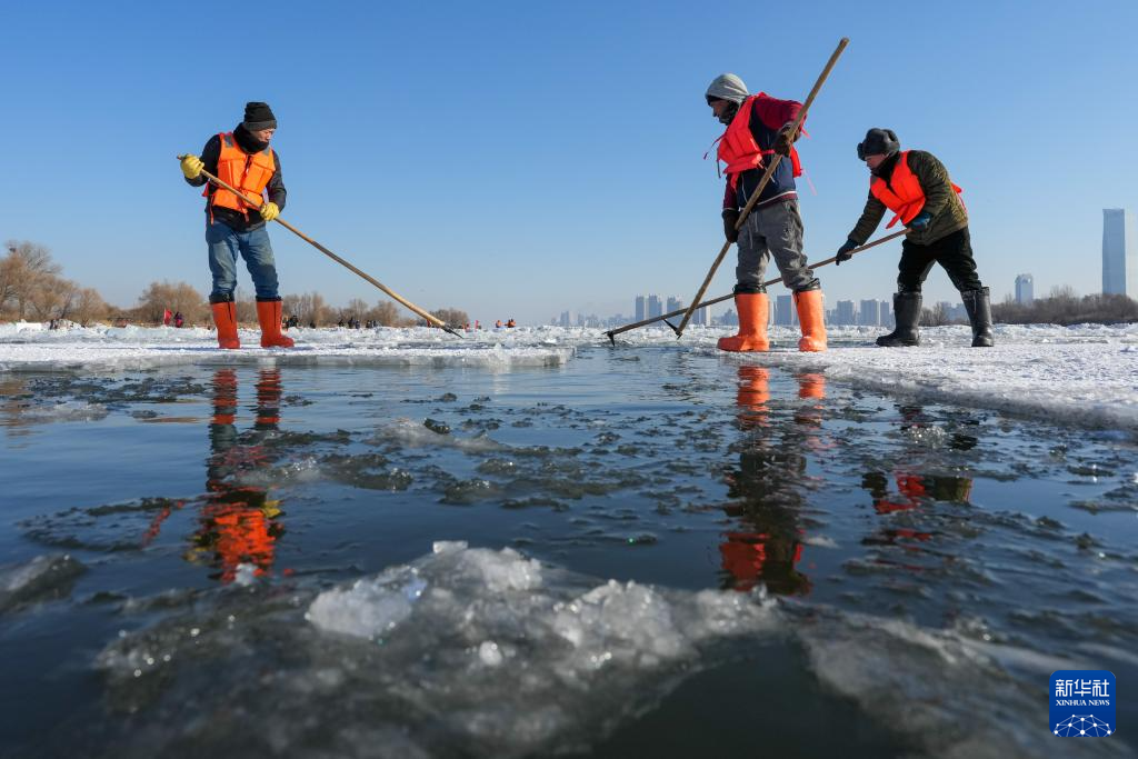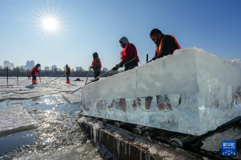 眼下,“冰城”哈尔滨采冰工作全面展开,采冰工人从松花江上采出优质冰料,源源不断地运往冰雪大世界园区等地,用于景观建设。