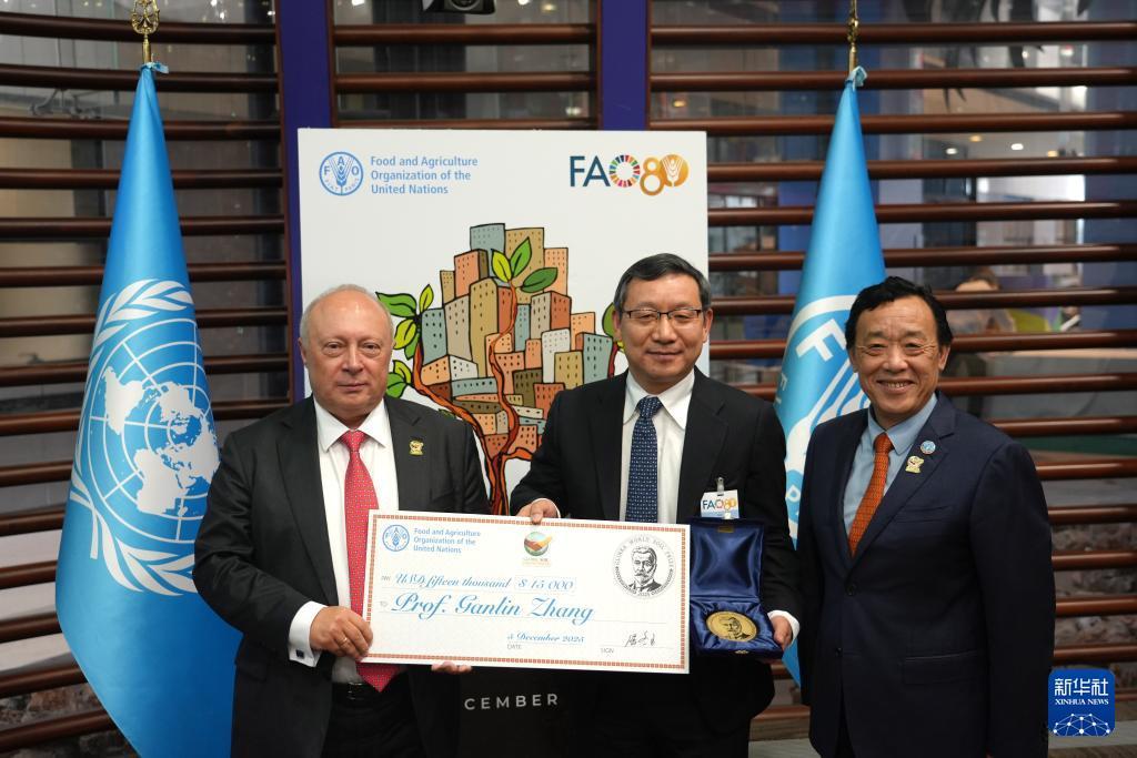 12月5日,在意大利首都罗马,联合国粮农组织总干事屈冬玉(右)向张甘霖(中)颁授2025年格林卡世界土壤奖奖牌。