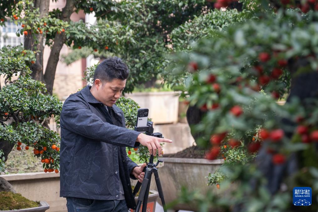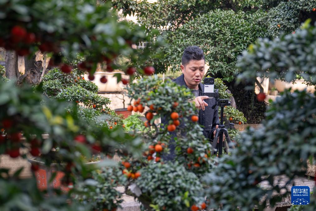 12月10日,在湖北省宜昌市长阳土家族自治县高家堰镇高家堰村,村民郑伟在直播销售院中盆景。