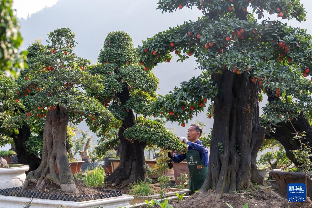 12月10日,在湖北省宜昌市长阳土家族自治县高家堰镇高家堰村,村民涂常兵在修剪院中盆景。