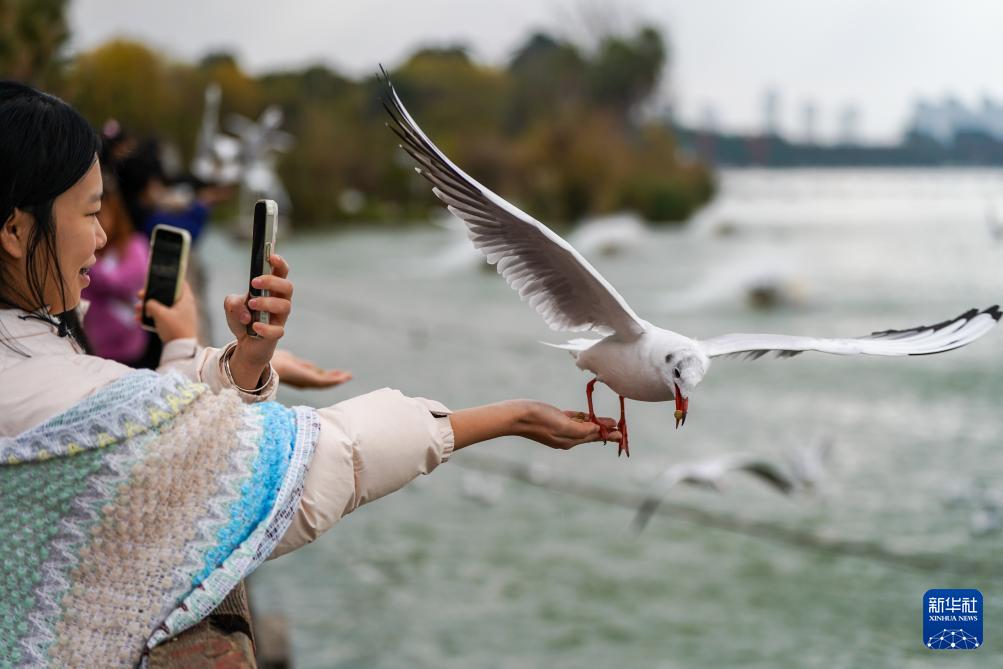 12月11日,游客在滇池畔的星海半岛生态湿地喂红嘴鸥。