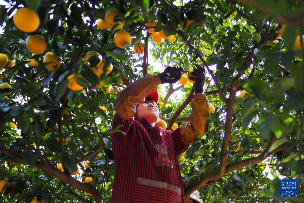 12月11日,在浙江省庆元县竹口镇黄坛水干果园区内,工人在采摘甜桔柚。