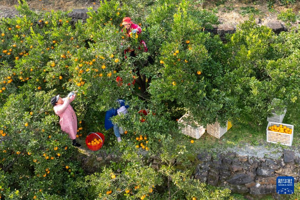 12月11日,在湖北省宜昌市长阳土家族自治县渔峡口镇岩松坪村,村民在采摘清江椪柑(无人机照片)。