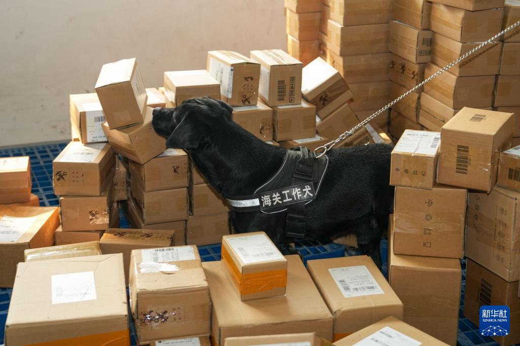 12月10日,海关工作犬在长沙国际邮件互换局查验进口包裹。