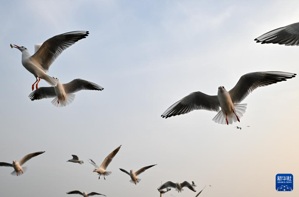 冬日,在天津市滨海新区的海贝乐园,成群的海鸥在此聚集栖息,吸引众多游人前来喂食、赏趣。