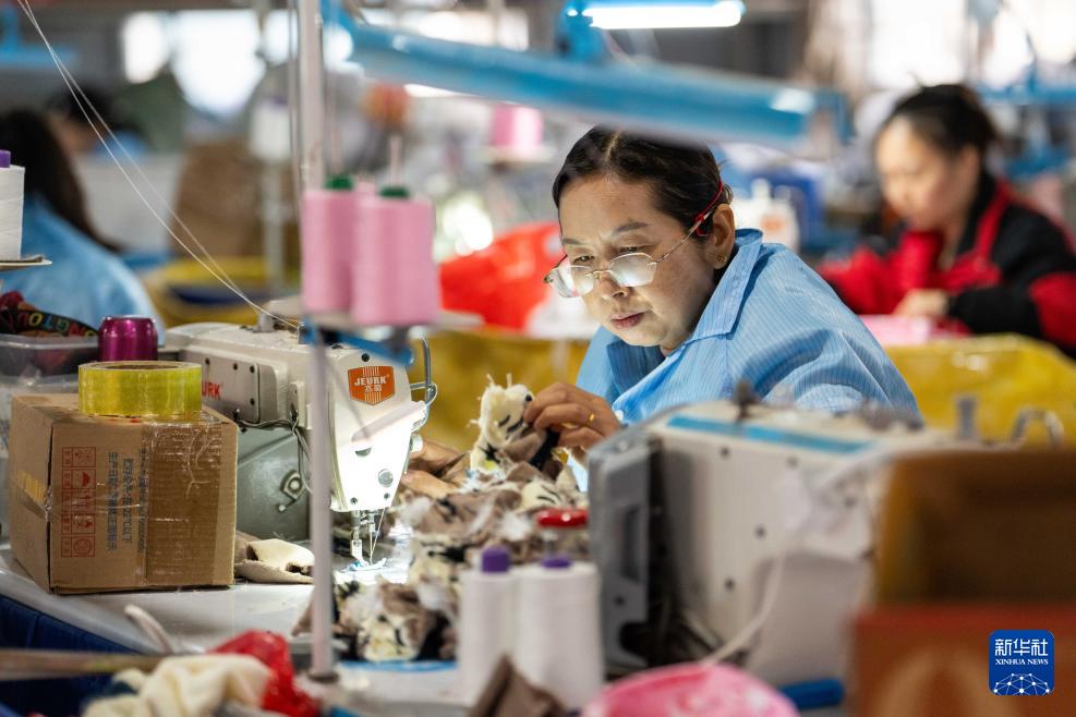 12月11日,在位于桃源县青林回族维吾尔族乡督粮冲村的常德市双阅玩具有限公司乡村车间,工人在制作布艺玩具。