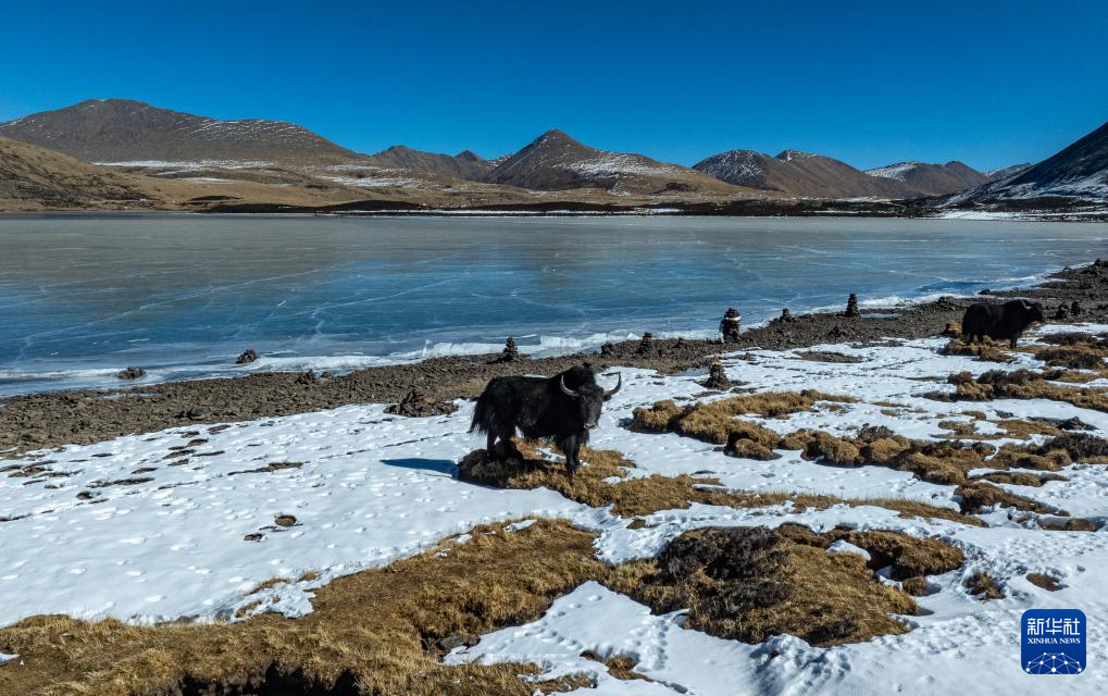 12月13日,牦牛驻足在思金拉错湖岸(无人机照片)。