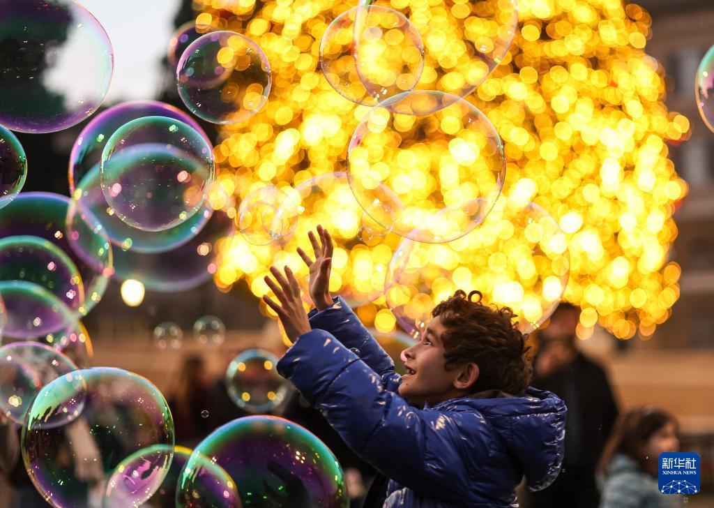 12月13日,小朋友在意大利首都罗马的人民广场玩泡泡。