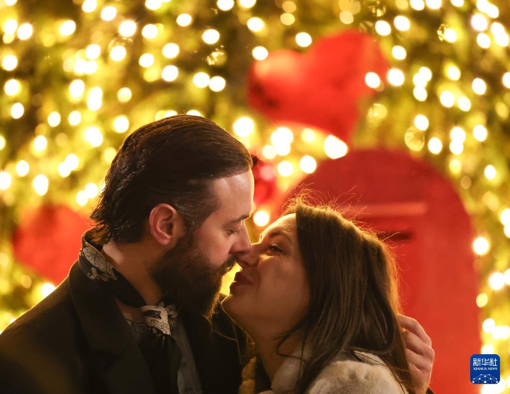 12月14日,一对情侣在意大利首都罗马市中心的科尔索大道附近与彩灯合影。