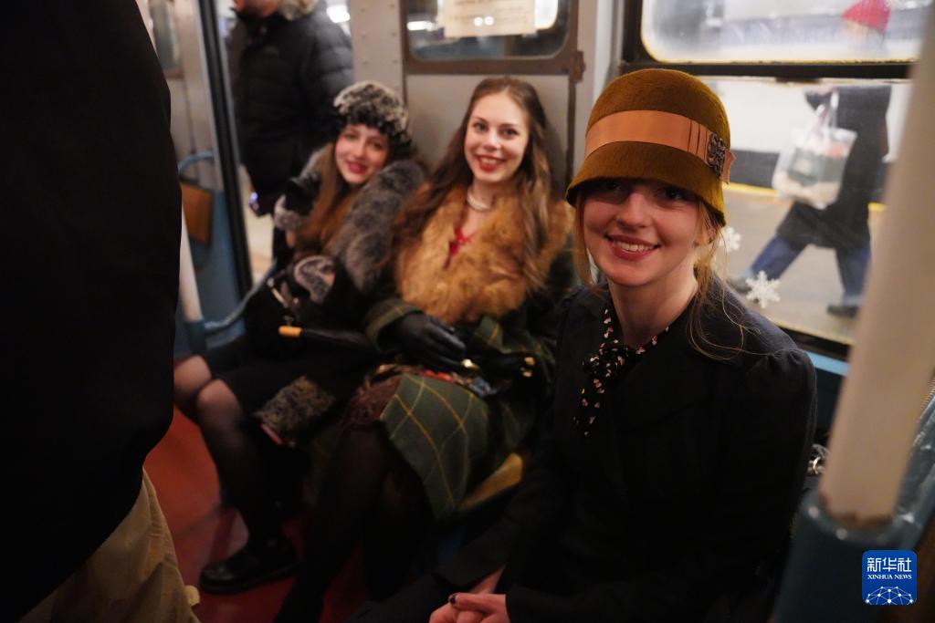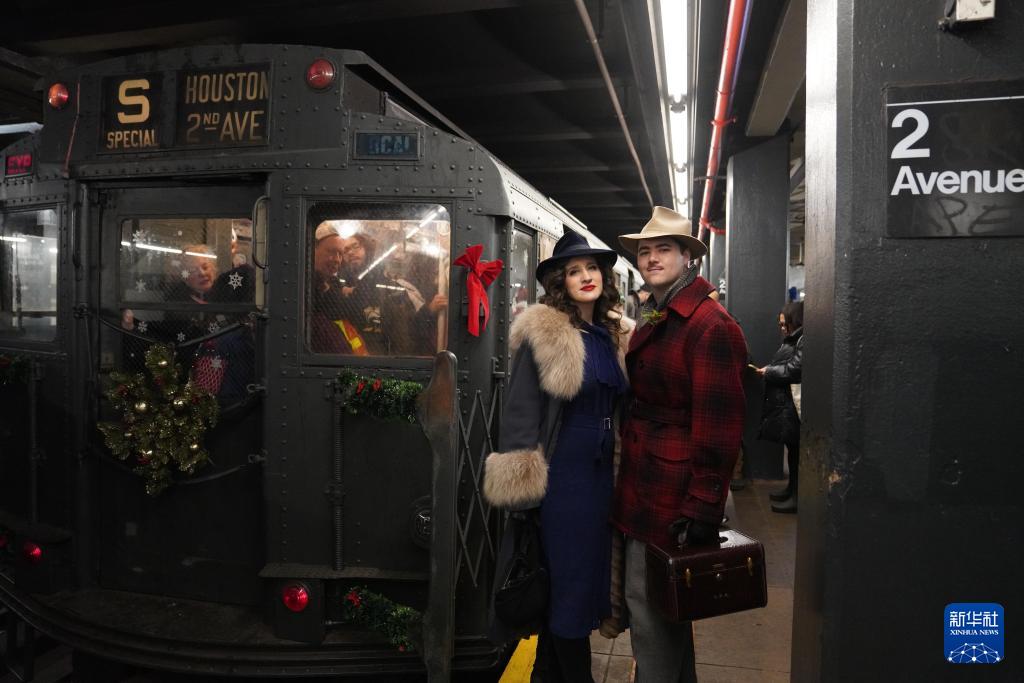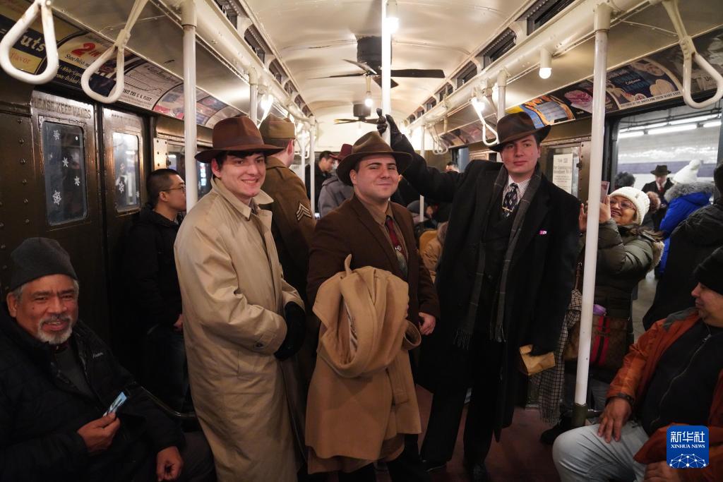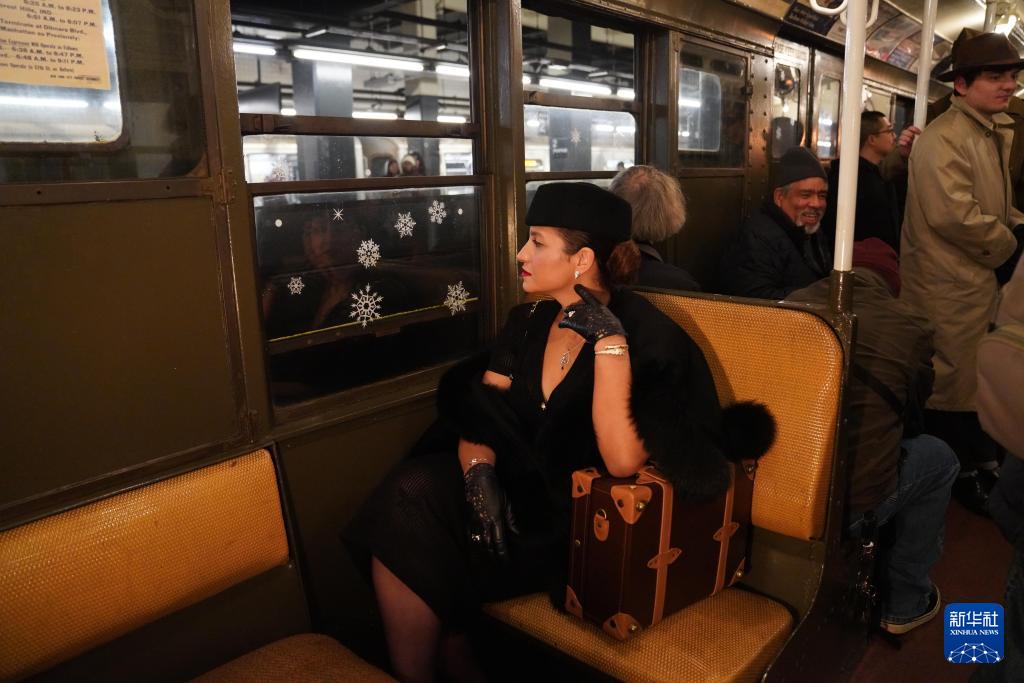 12月14日,在美国纽约,人们身着怀旧服饰乘坐“怀旧地铁”。