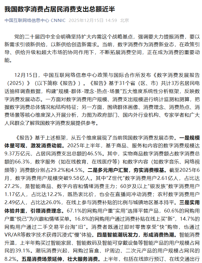 12月15日,中国互联网络信息中心政策与国际合作所发布《数字消费发展报告(2025)》(以下简称《报告》)。《报告》基于31个省(区、市)共计3万名居民电话抽样调查数据,构建"规模-群体-理念-热点-场景"五大维度系统性分析框架,反映数字消费发展动态。一方面对数字消费用户规模、消费支出规模进行统计监测和测算,把握数字消费总体情况和结构特征;另一方面,围绕群体画像、消费理念、消费热点、消费场景等核心维度深入开展分析,力图为政府部门、国内外行业机构、专家学者和广大人民群众了解我国数字消费发展提供参考。