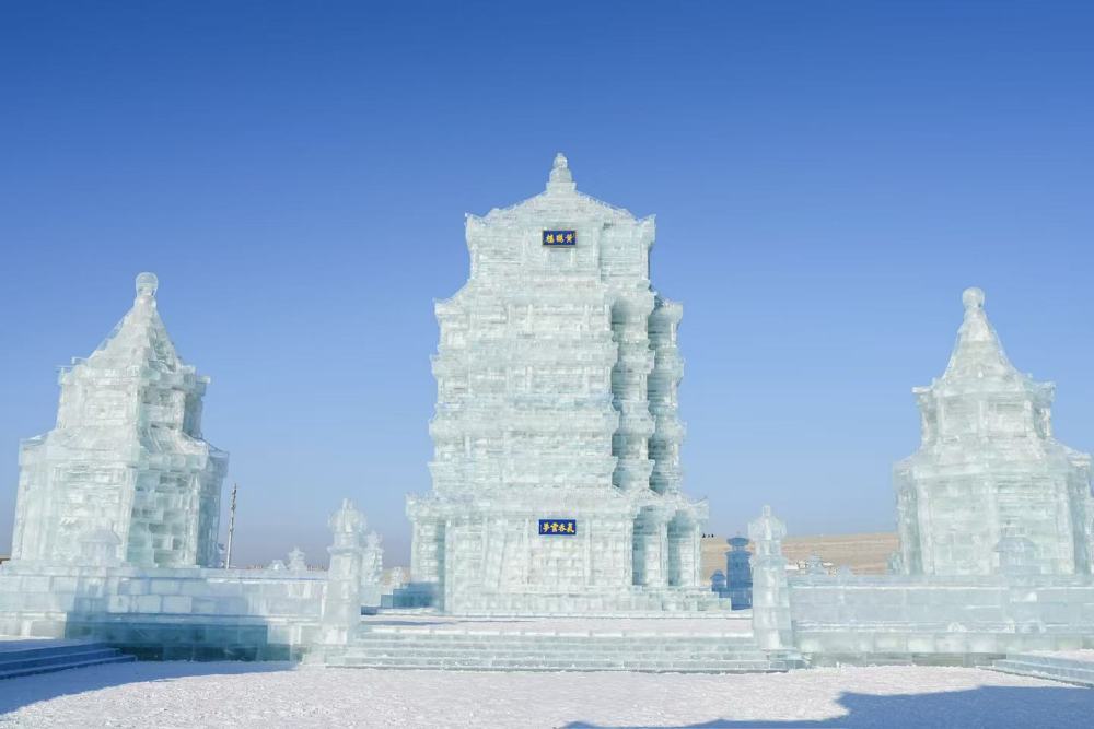在园区内,以武汉黄鹤楼为原型的冰建,充满“鹤影掠空”的东方意境;比利时布鲁塞尔市标“小于廉”冰雕,见证中比两国友好交流。以哈尔滨火车站为蓝本的主形象大门、中华巴洛克风格的冰雪景观群,将这座城市的历史文脉凝结于冰雪之中。