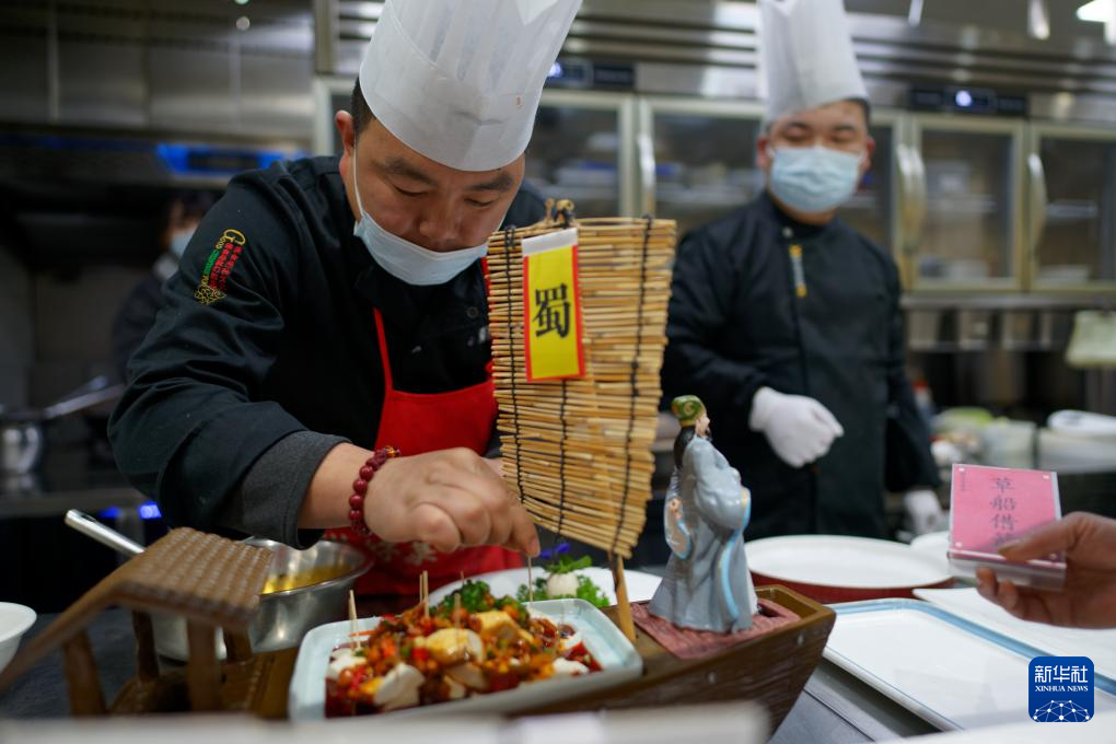12月13日,厨师在四川省广元市剑阁县的一家餐馆内制作三国特色豆腐菜"草船借箭"。