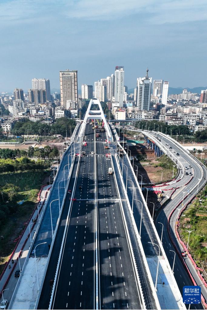这是重建后的钦江二桥,施工队正在铺设路面(12月17日摄,无人机照片)。