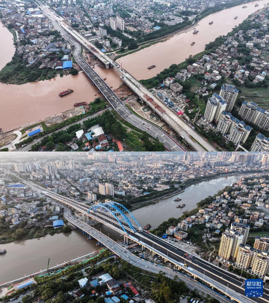 拼版照片:上图是2024年4月25日拍摄的钦州三桥(无人机照片);下图是2025年12月17日拍摄的钦州三桥(无人机照片)。