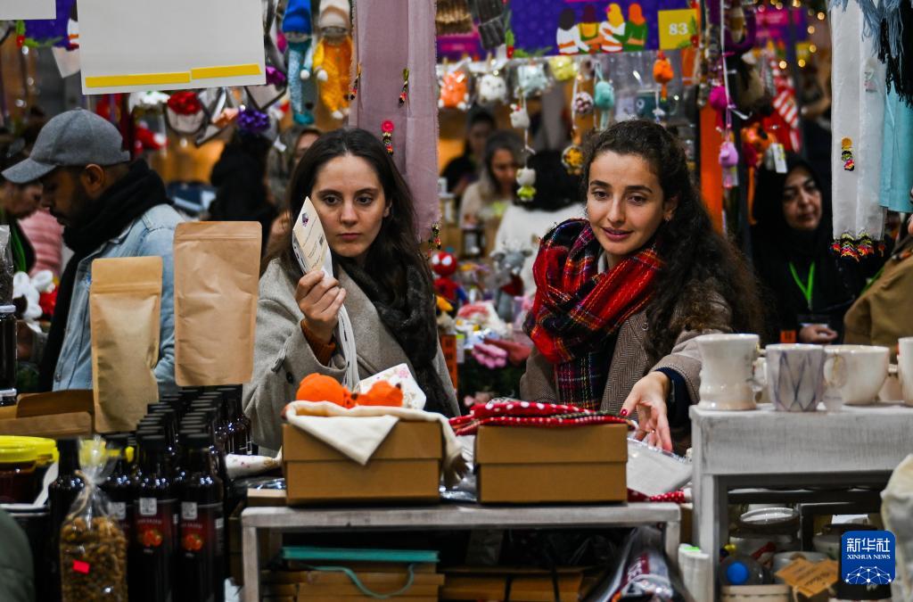 12月17日,顾客在土耳其伊斯坦布尔加拉塔港钟楼广场新年购物节上选购商品。