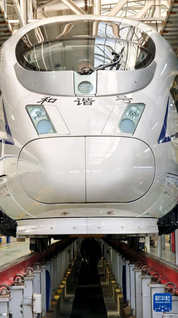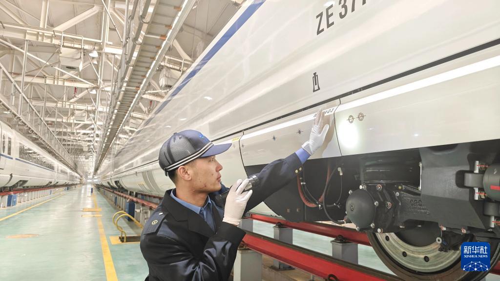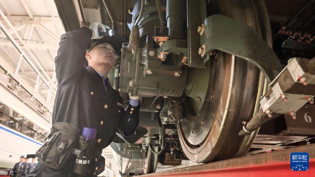 12月21日,中国铁路兰州局集团有限公司兰州车辆段银川动车运用所的工作人员对列车进行检修。他们用专业的坚守,护航每一趟列车的冬日征程,守护万千旅客的平安归途。