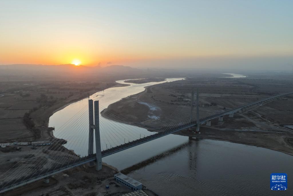 12月23日在日出时分拍摄的包银高铁乌海黄河特大桥。