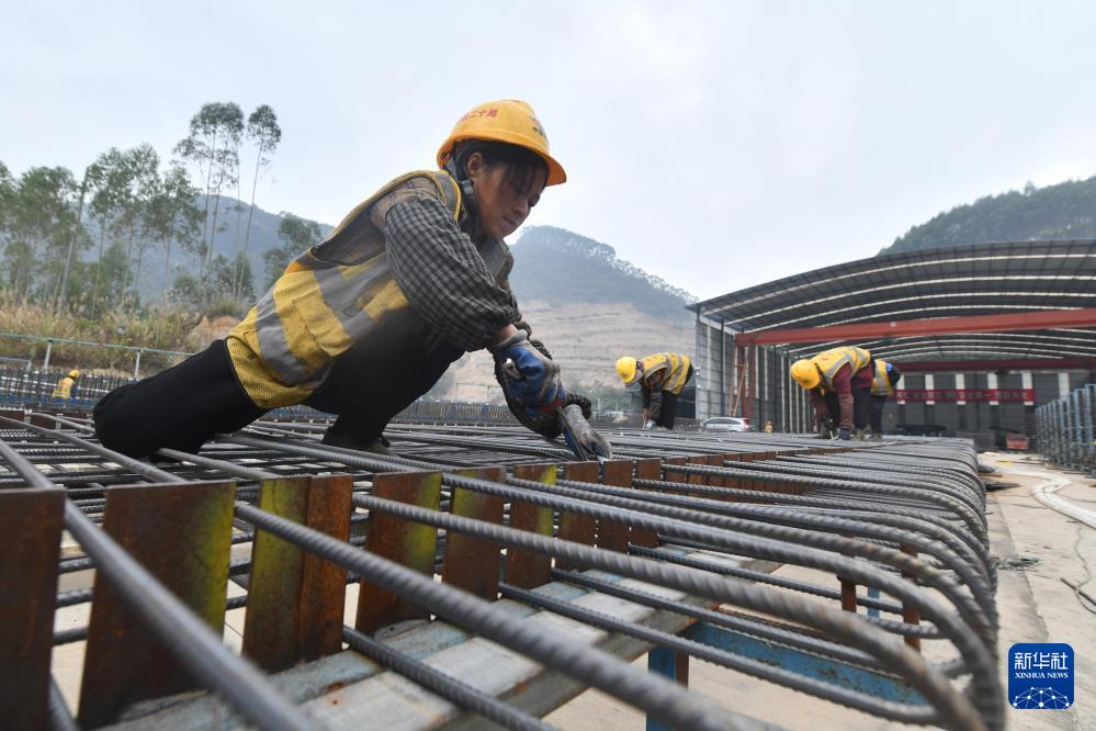 12月23日,中铁二十局的工人在柳州市柳江区三都镇鱼宜高速公路建设工地作业。