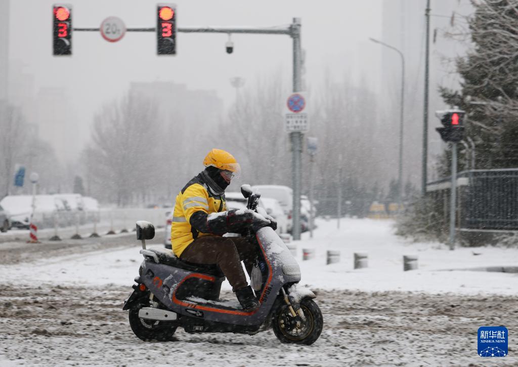 12月23日,一名外卖员冒雪行进在沈阳街头。