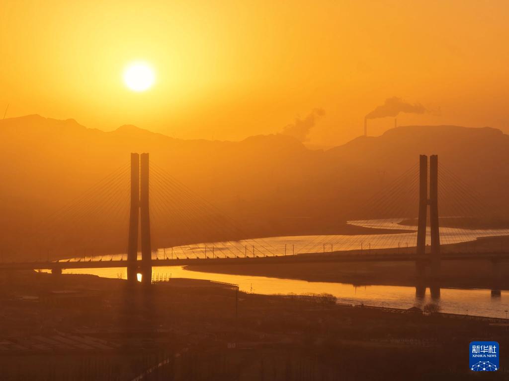 12月23日在日出时分拍摄的包银高铁乌海黄河特大桥。