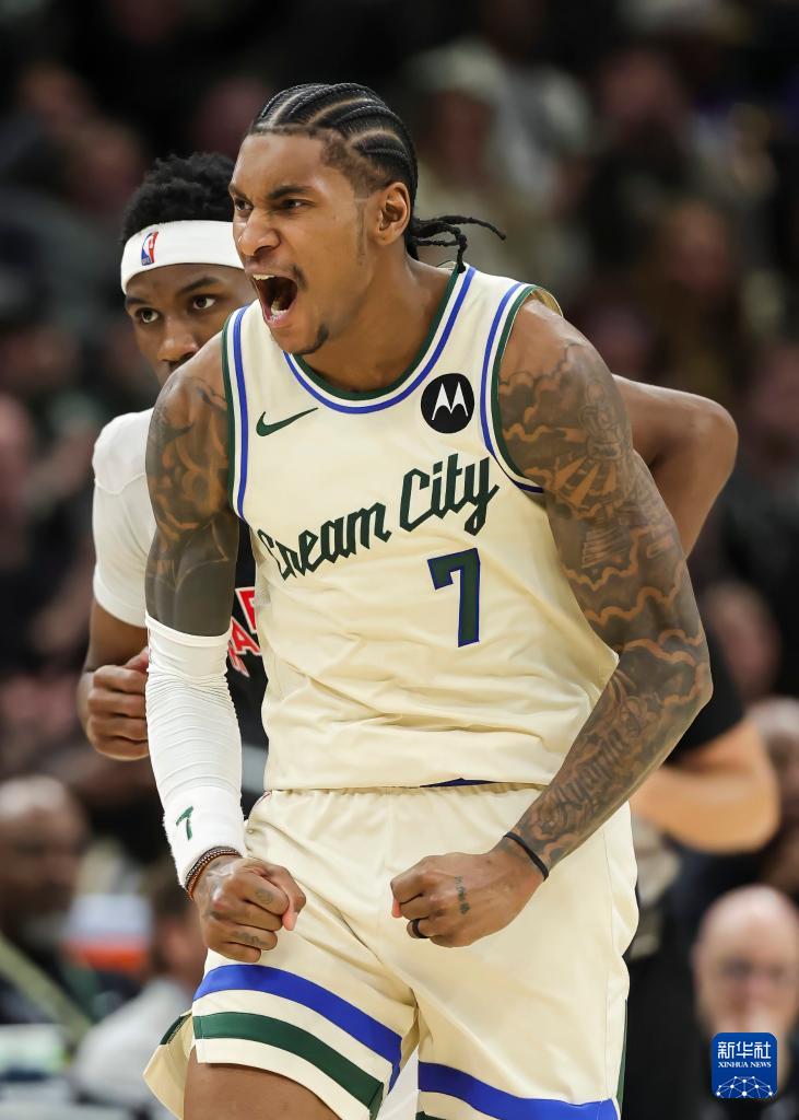 12月18日,雄鹿队球员波特(前)在比赛中庆祝。