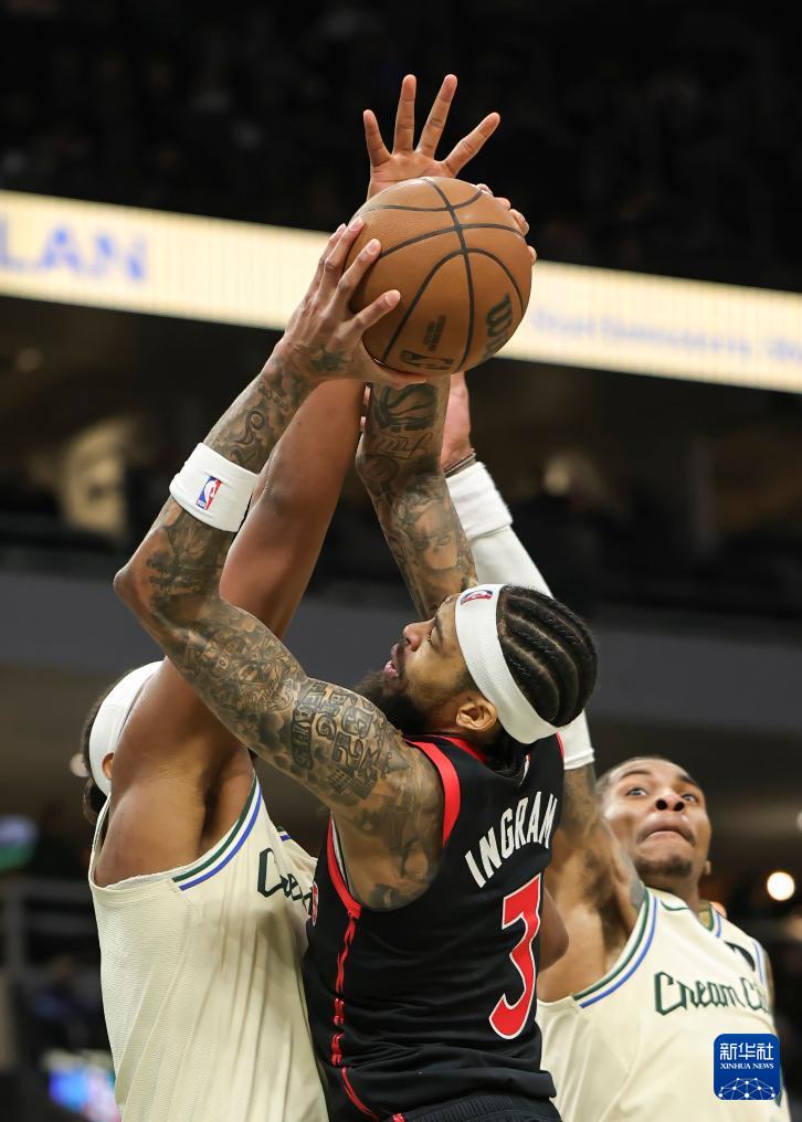 12月18日,猛龙队球员英格拉姆(中)在比赛中拼抢。