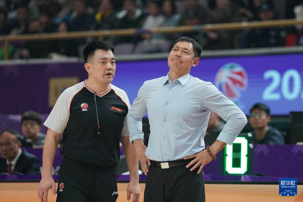 12月18日,北京控股队主教练张庆鹏(右)在比赛中。