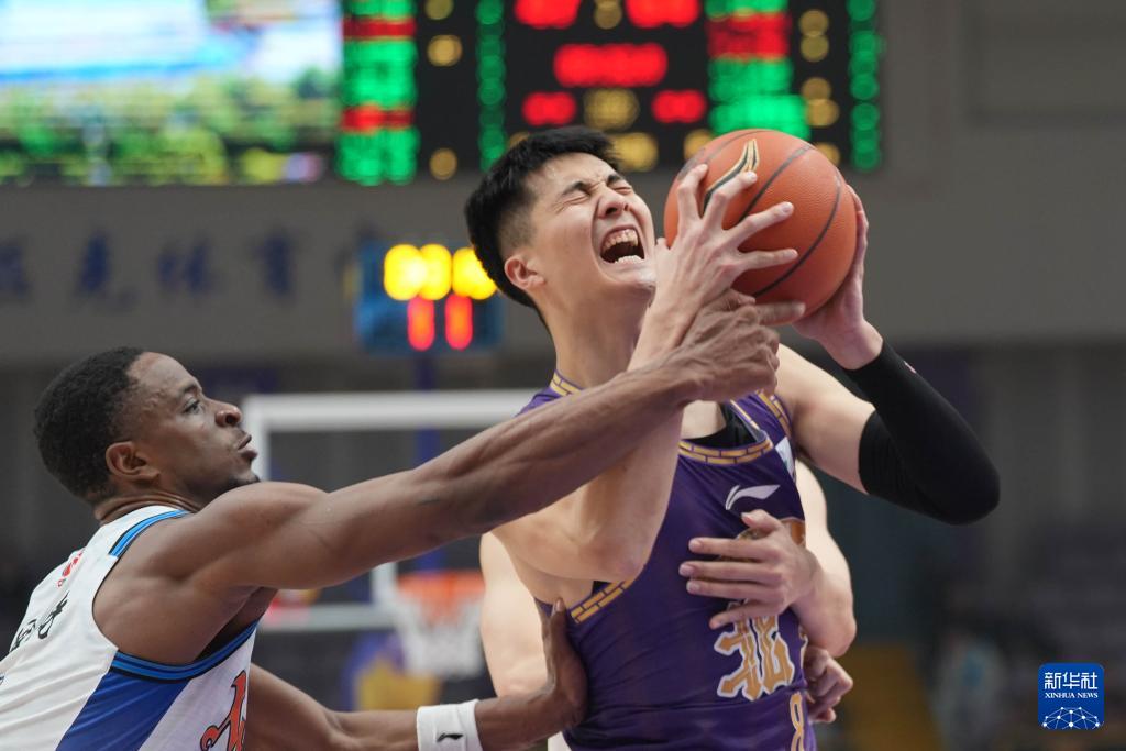 12月18日,新疆伊力特队球员纳托尔(左)在比赛中上篮。