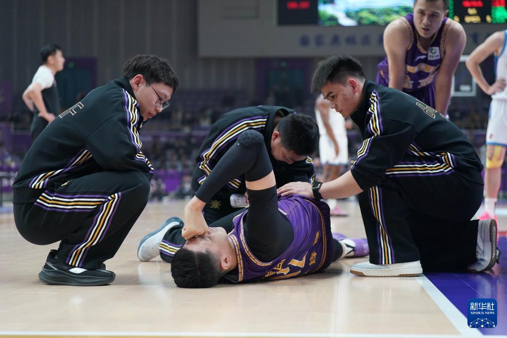 12月18日,北京控股队球员沈梓捷(中下)在比赛中受伤倒地。