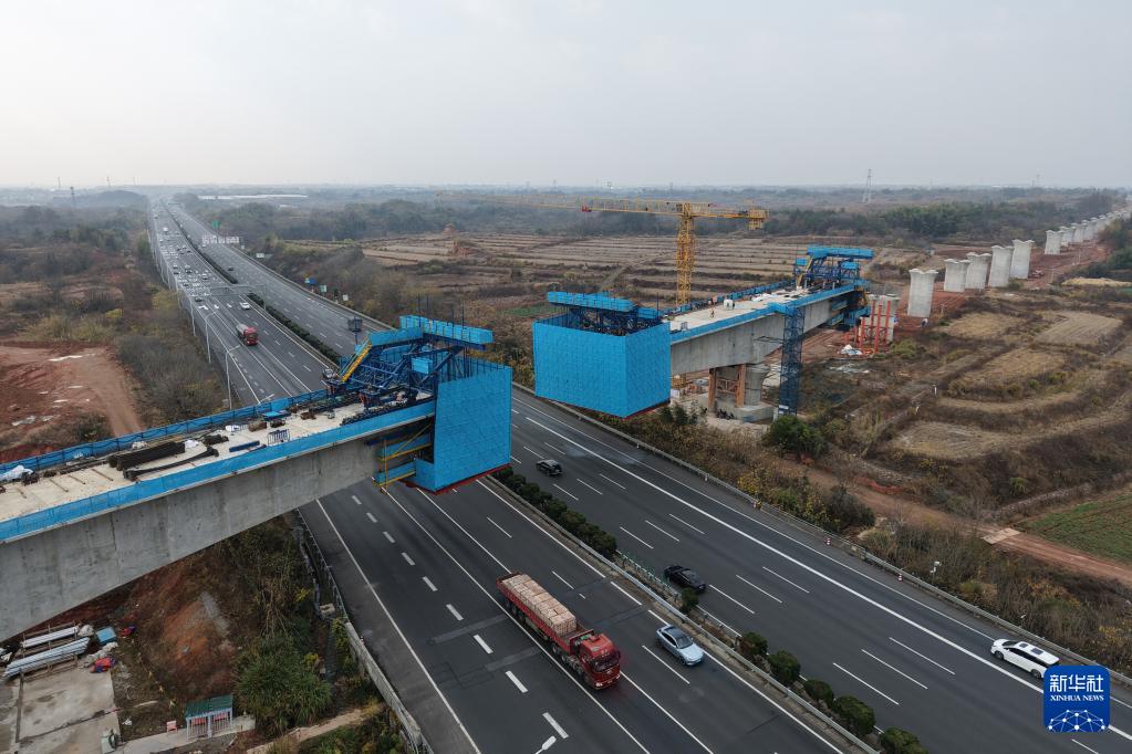 12月25日拍摄的衢丽铁路衢江特大桥跨沪昆高速公路连续梁作业现场(无人机照片)。