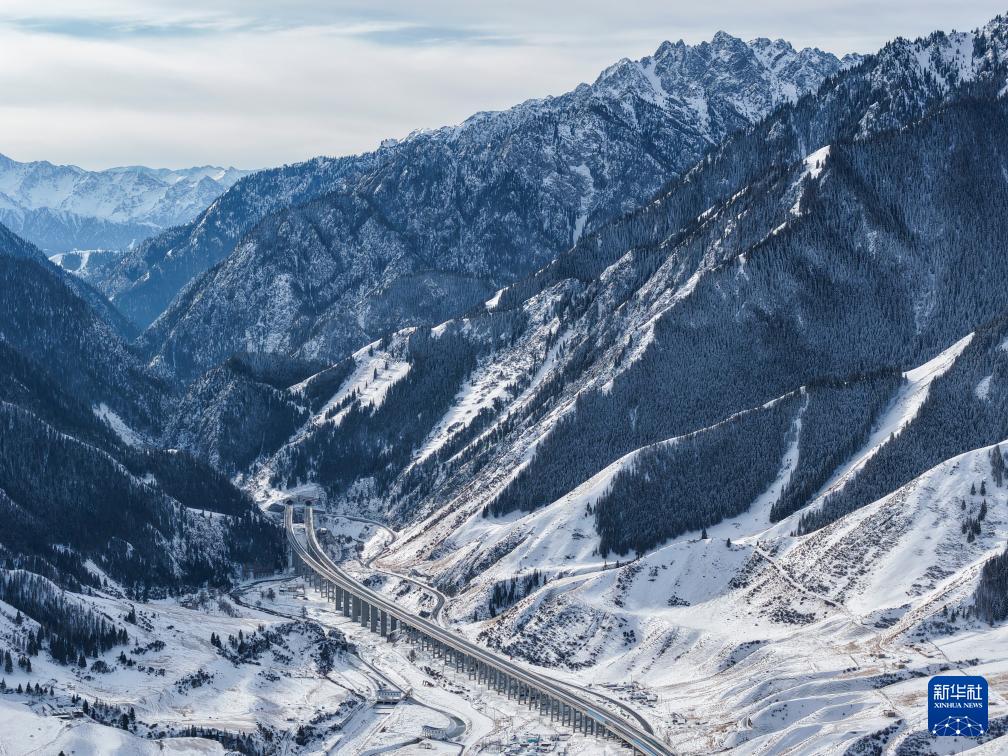 桥隧相连的乌尉高速公路穿越天山山脉(12月23日摄,无人机全景照片)。