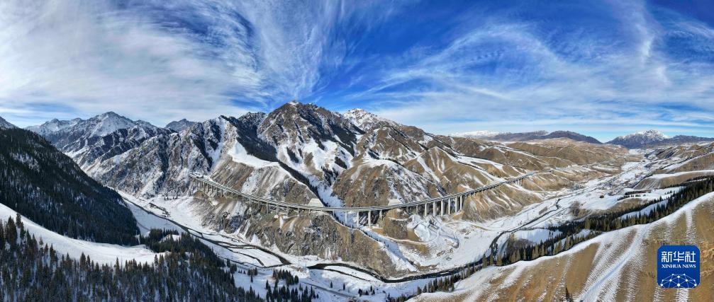 桥隧相连的乌尉高速公路穿越天山山脉(12月20日摄,无人机全景照片)。