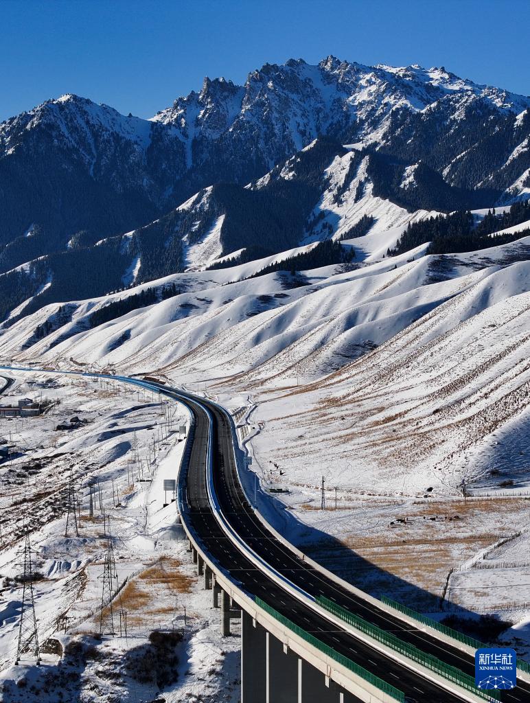 新疆乌尉高速公路蜿蜒在天山中(12月23日摄,无人机照片)。