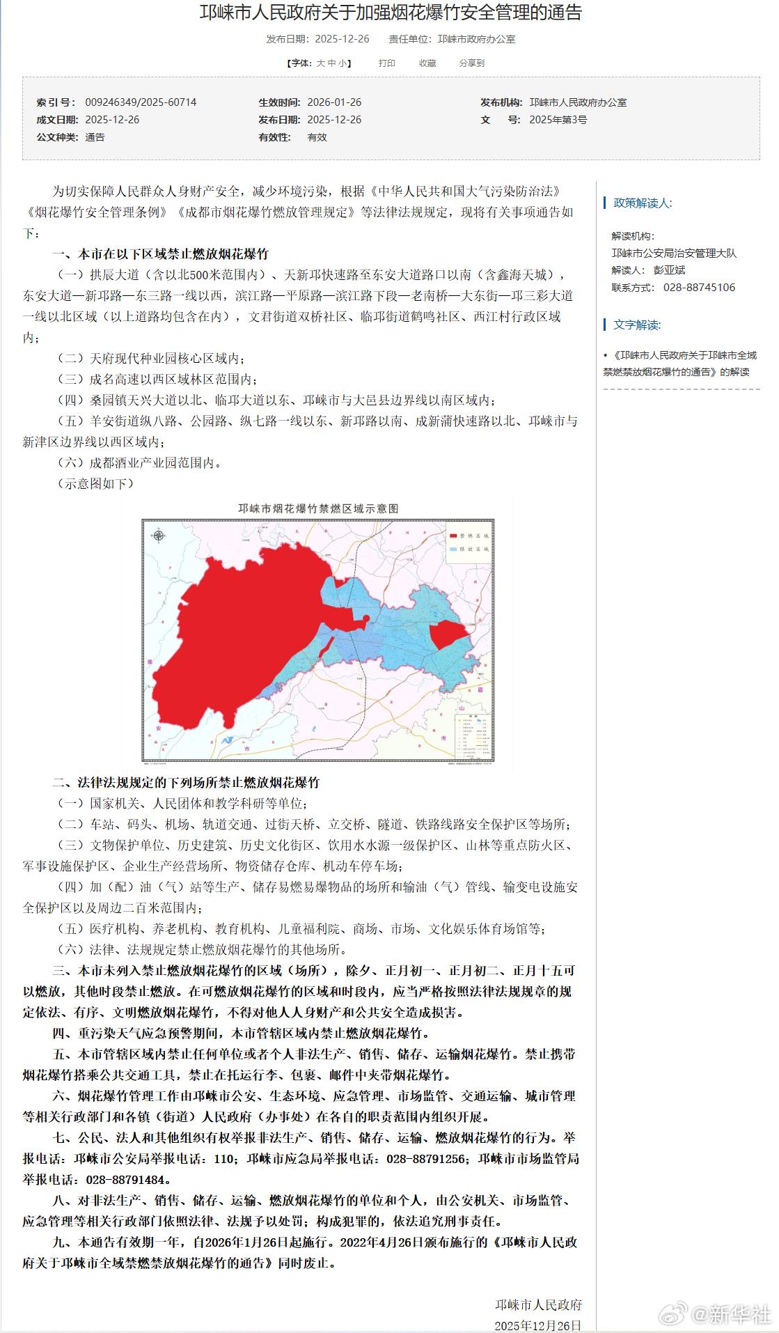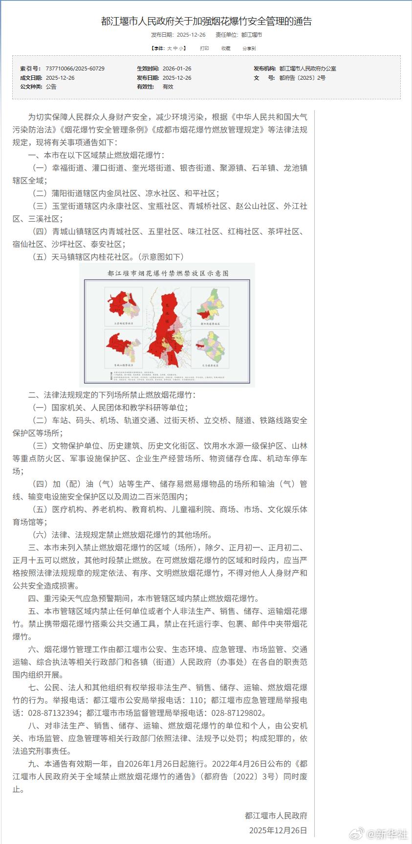 12月26日,成都8县市陆续发布烟花爆竹安全管理《通告》,对本区域的烟花爆竹燃放管理进行优化调整。《通告》显示,在成都8县市划定的限制燃放区域内,市民群众可在除夕、正月初一、正月初二、正月十五这四天燃放烟花爆竹。(记者:董小红)