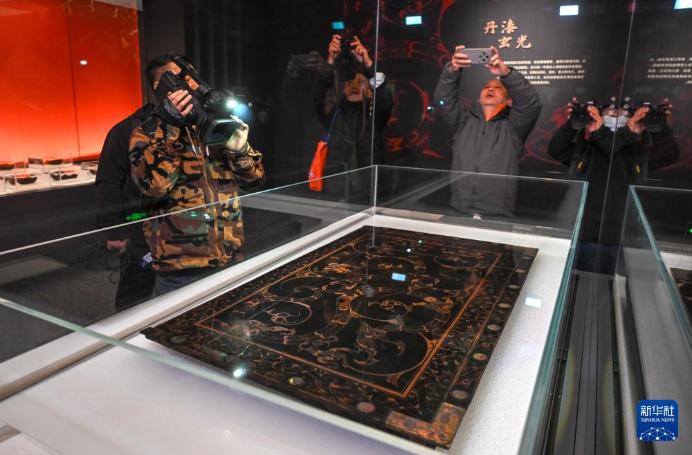 这是展出的彩绘龙凤纹漆木案(12月26日摄)。