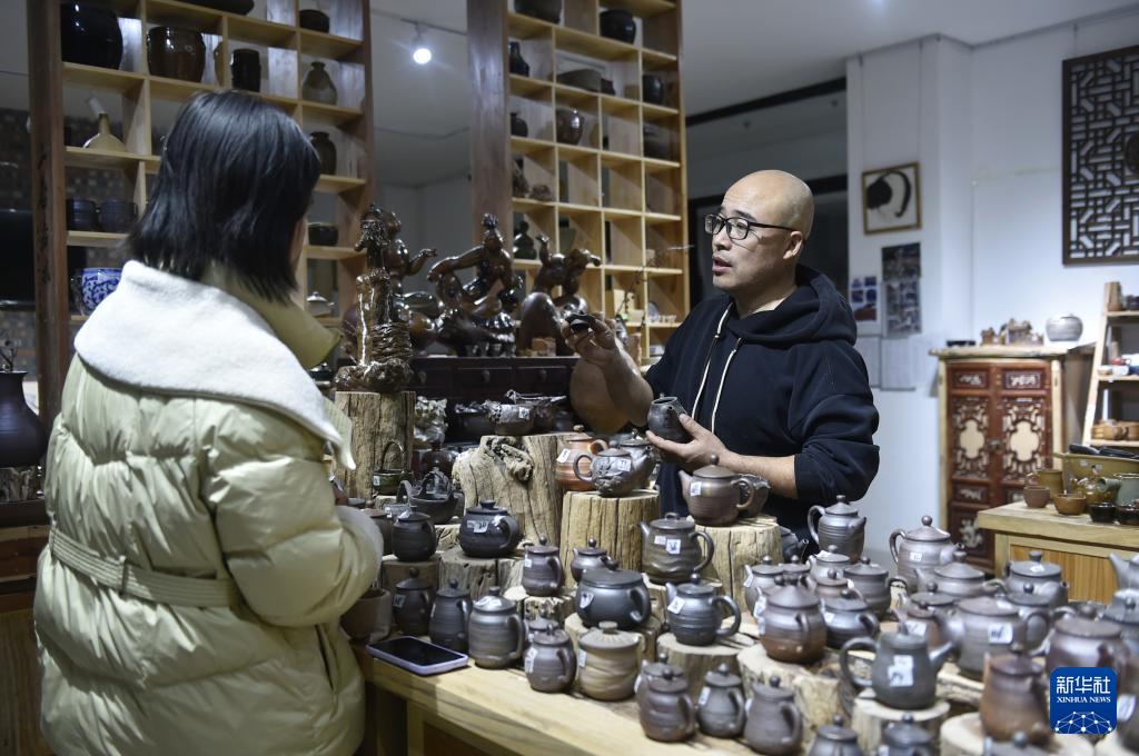 12月25日,定瓷艺人闫玉伟(右)在位于河北省曲阳县的工作坊里向来宾介绍自己的粗瓷作品。