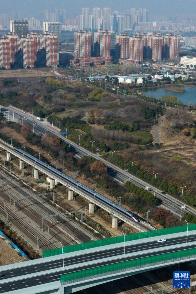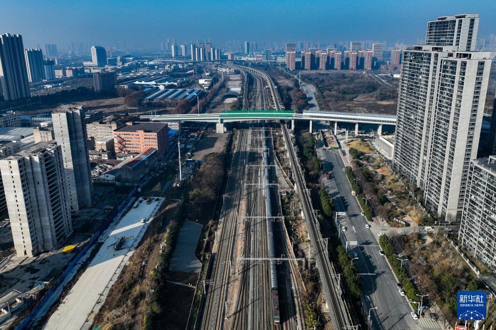 12月28日,列车从武汉古田一路北段下方穿行(无人机照片)。