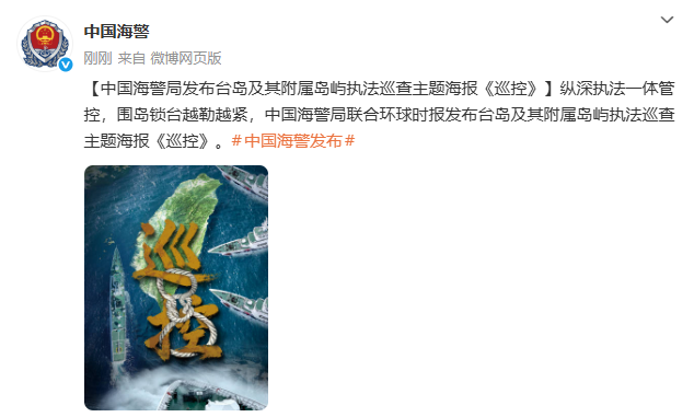 【中国海警局发布台岛及其附属岛屿执法巡查主题海报《巡控》】纵深执法一体管控,围岛锁台越勒越紧,中国海警局联合环球时报发布台岛及其附属岛屿执法巡查主题海报《巡控》。