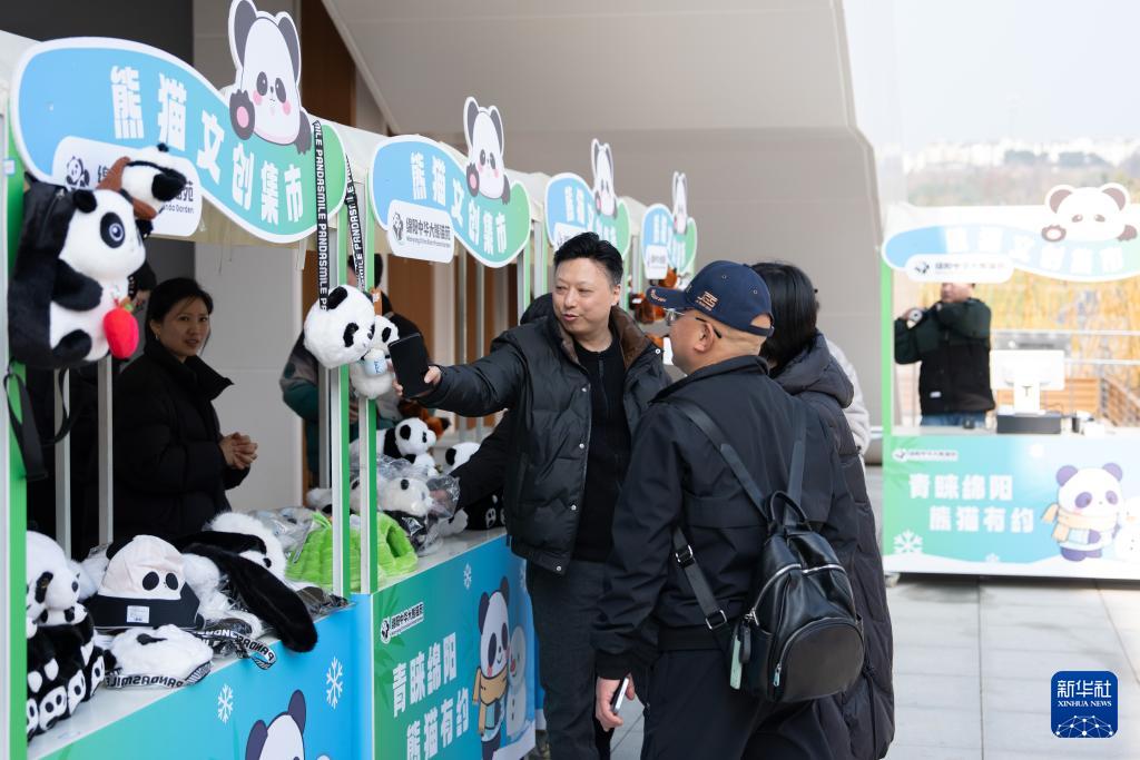 12月29日,游客在中国大熊猫保护研究中心绵阳基地熊猫文创集市上选购大熊猫文创产品。