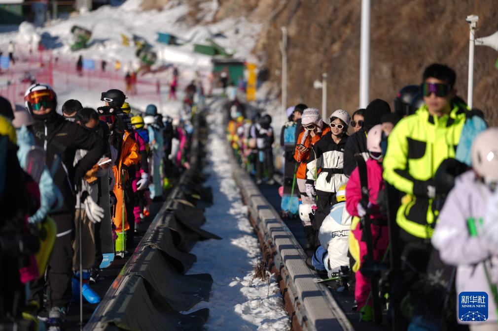 游客在湖州安吉云上草原滑雪场有序乘坐魔毯(12月28日摄)。