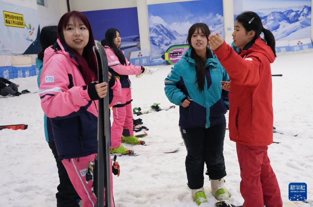 12月29日,在湖州太湖龙之梦乐园冰雪世界,教练带领游客体验滑雪运动。
