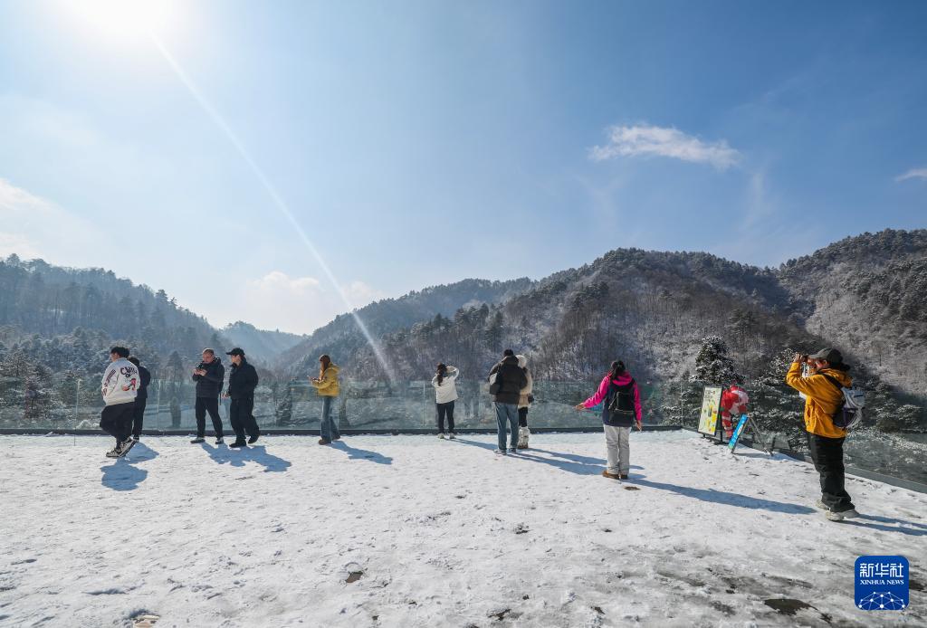 12月25日,游客们在杭州临安大明山万松岭滑雪场欣赏雪景。