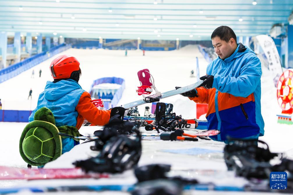 12月29日,游客(左)在湖州太湖龙之梦乐园冰雪世界内租用雪具。