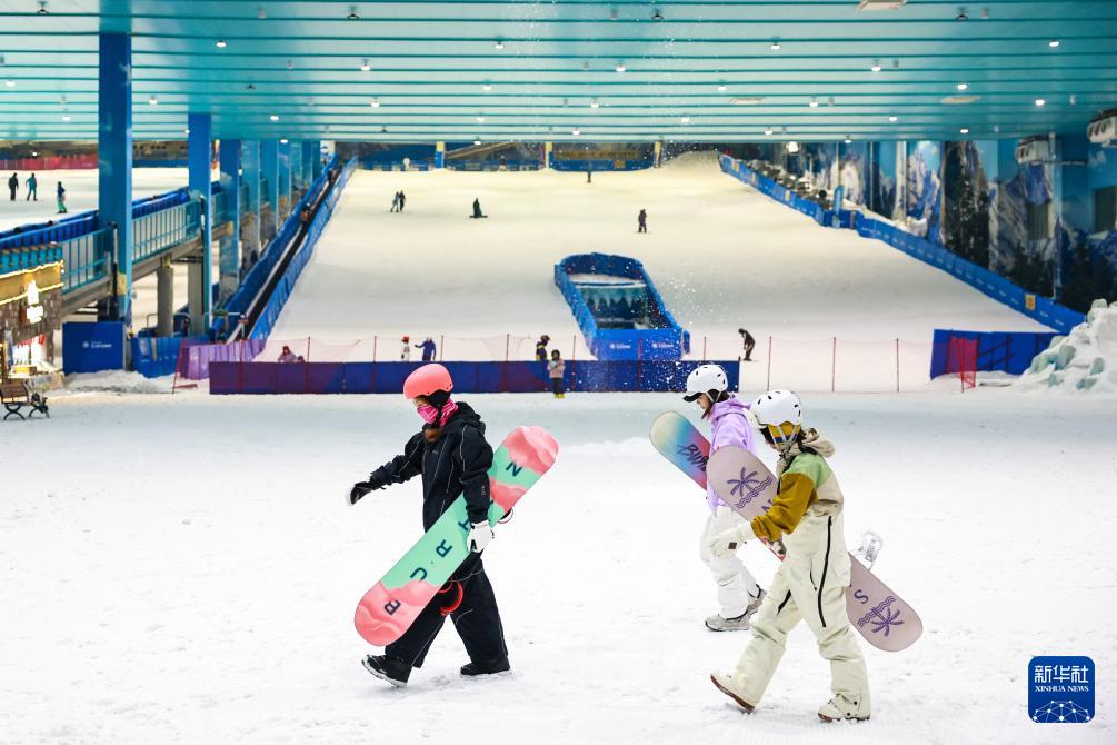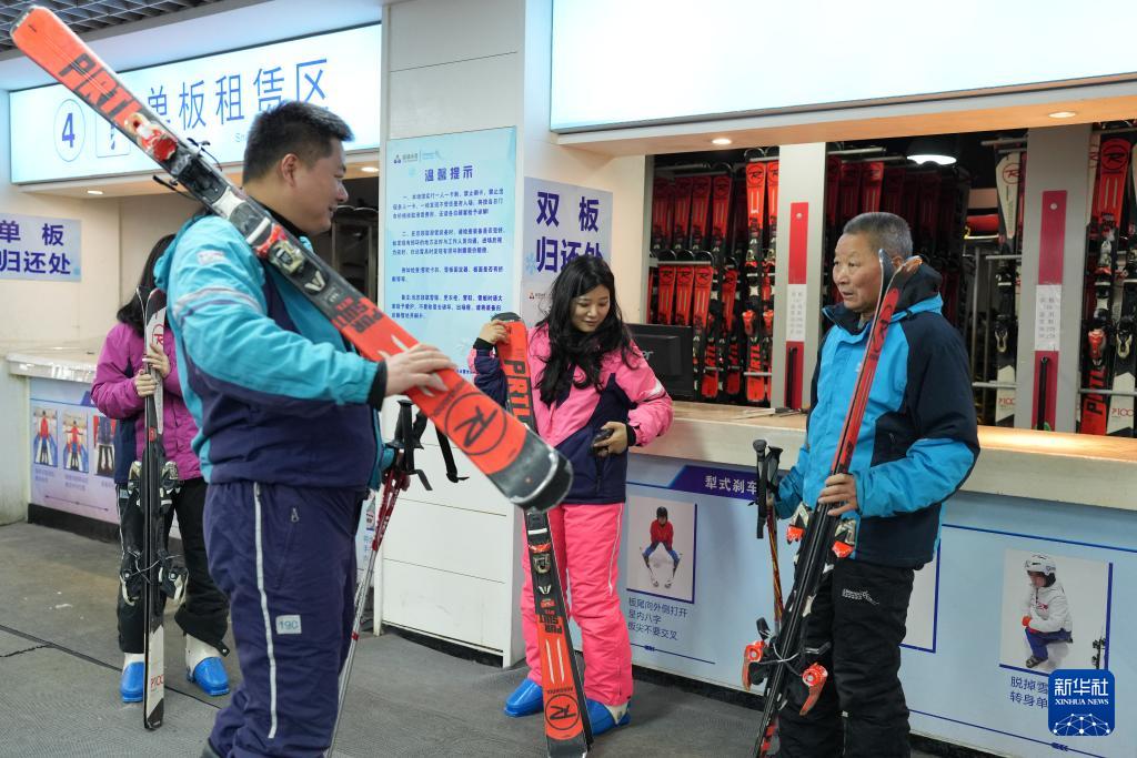人们在绍兴乔波冰雪世界租借雪具准备进入雪场(12月24日摄)。