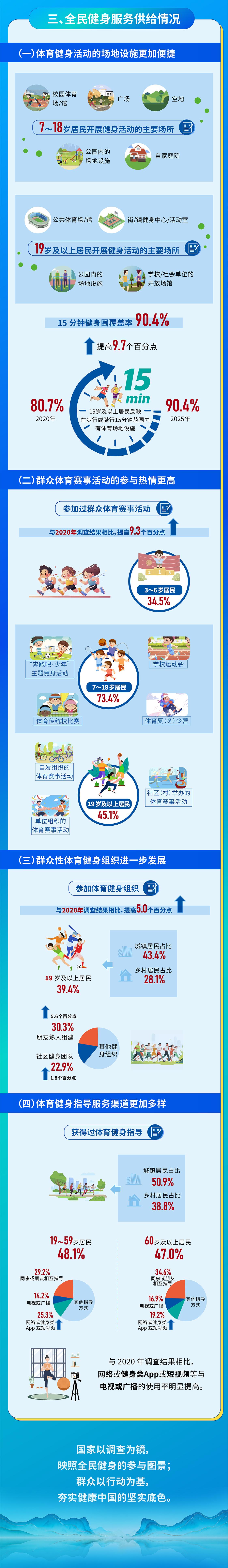 摘要:《2025年全民健身活动状况调查公报》日前正式发布。作为全面评估《全民健身计划》实施成效的重要依据,该报告系统呈现了我国城乡居民健身行为现状、需求特征及发展短板,为“十五五”时期全民健身公共服务体系优化提供了科学支撑。