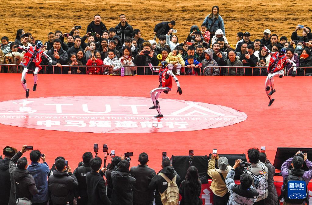 1月1日,机器人在贵州省三都水族自治县举行的“村马”比赛间隙表演节目。