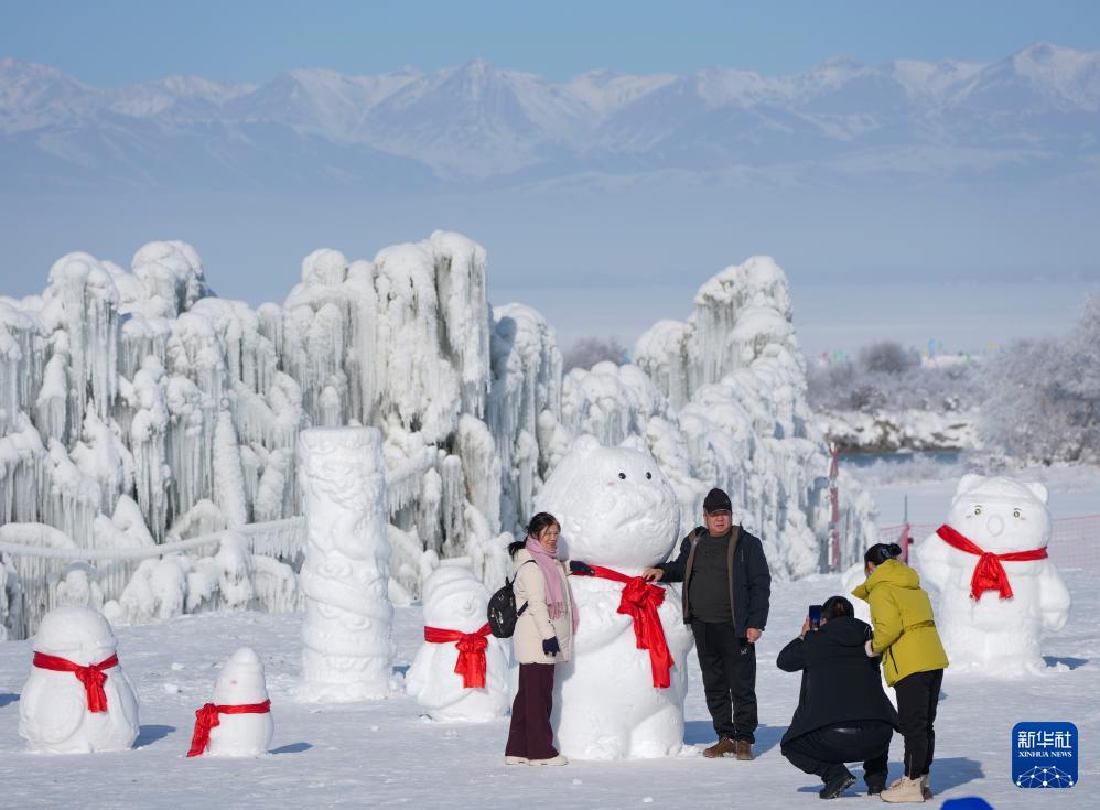 1月3日,游客在新疆昭苏县冰雪乐园参观冰雕作品。