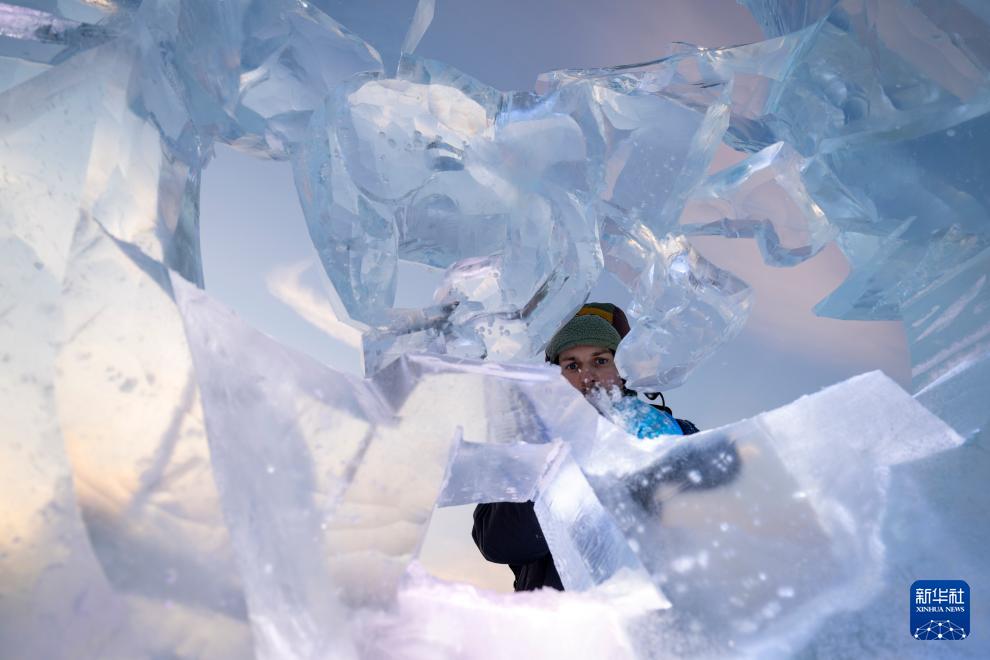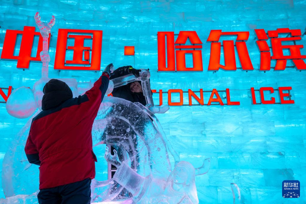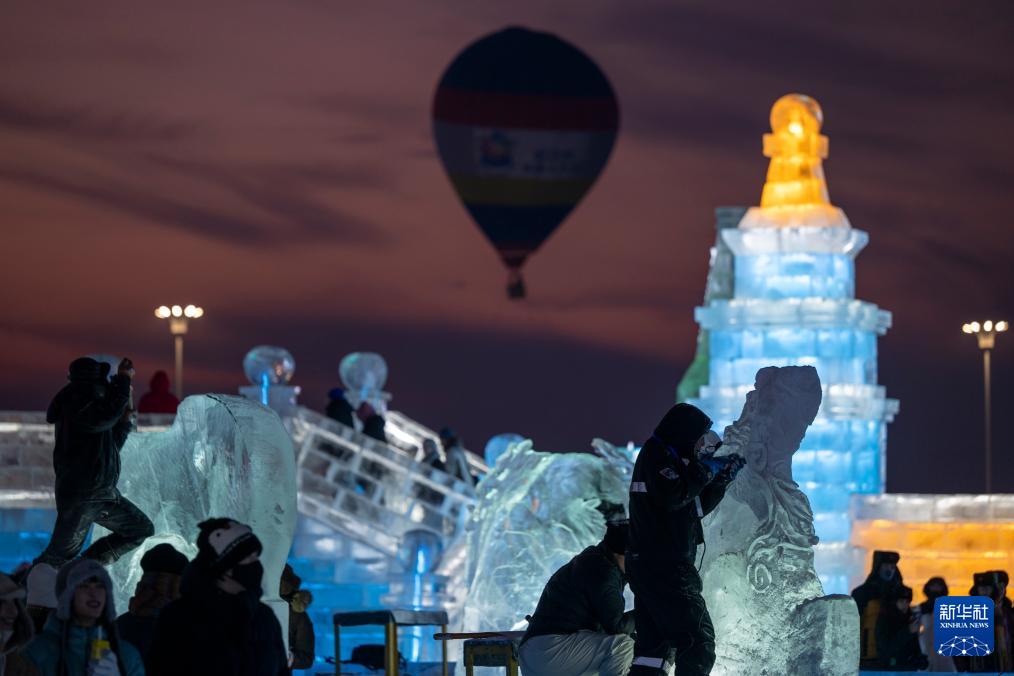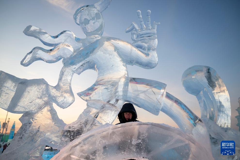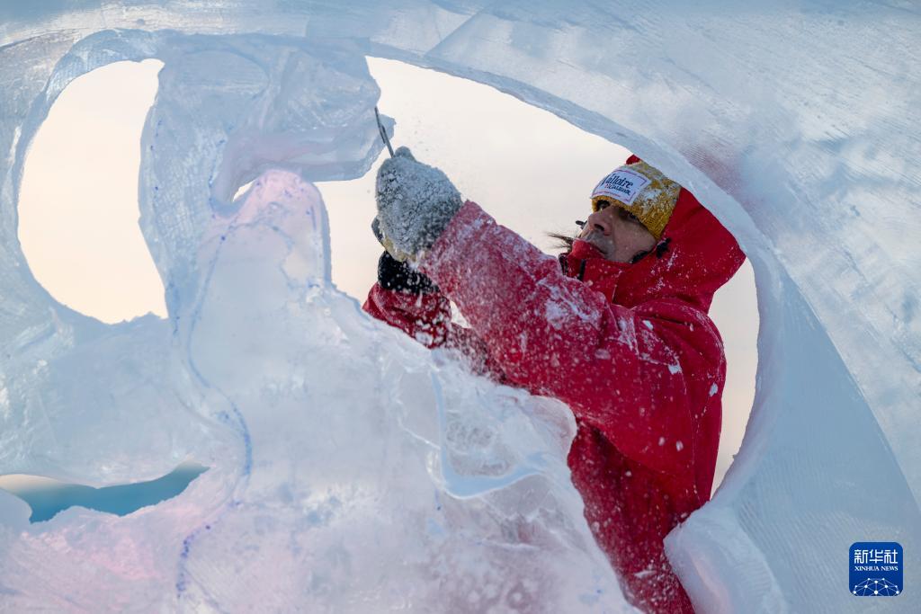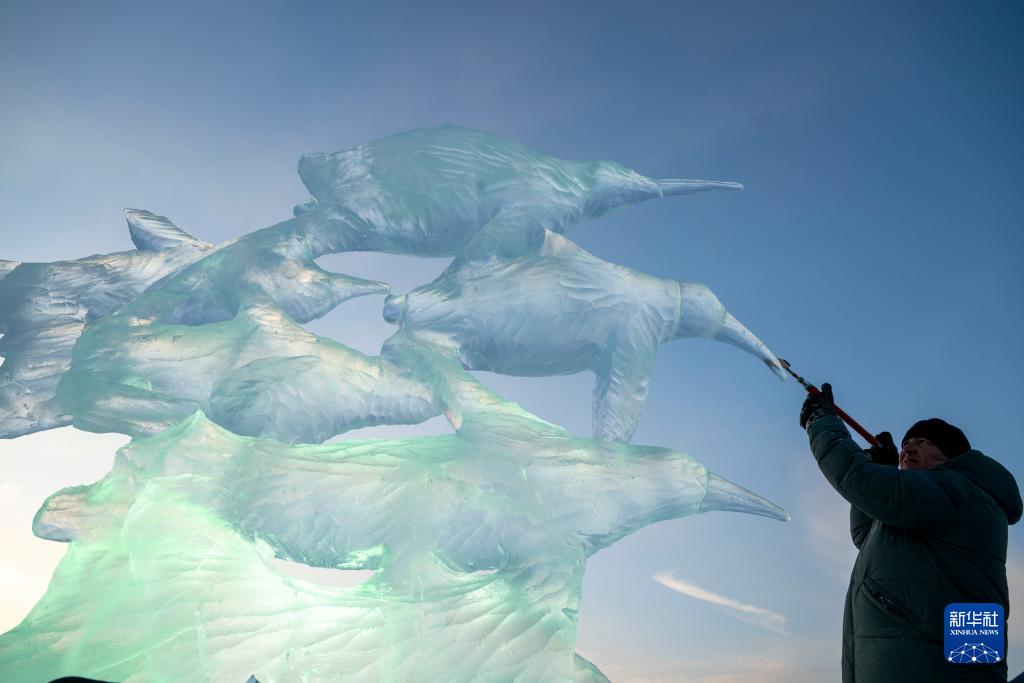 1月3日,参赛选手在哈尔滨冰雪大世界园区内进行冰雕创作。