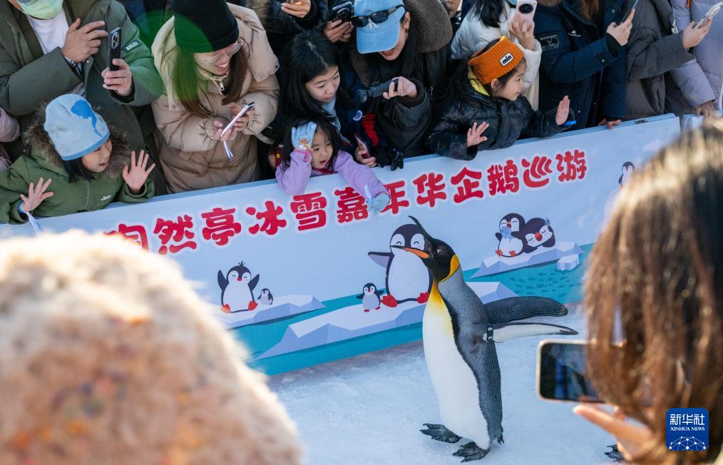 1月3日,游客在北京市陶然亭公园冰雪嘉年华观看企鹅巡游。